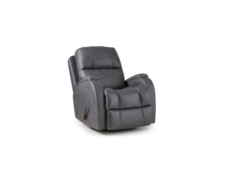 The 214 Zena is a medium-scale glider recliner with a 360 degree swivel base. The chair features a subtle scoop seat, a solid foam track arm, and a pad-over chaise for extra leg support. The polyester, faux leather cover is easy to maintain.