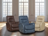 The 250 Revelation is a medium-scale recliner with a 360-degree swivel-glider base. The chair features top-grain, cowhide leather, clean lines, a solid foam track arm, and a pad-over chaise for extra leg support. The polished aluminum handle is both stylish and functional, and adds a modern, chic finish to this streamlined rocker recliner.